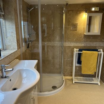 The bathroom has a large vanity unit, a separate shower and deep bath in which to relax. From the bathroom there are views towards Carn Llidi, the highest point of St David’s Head; the historic Bishops Palace and our tranquil garden, except when the rooks are roosting at dusk!