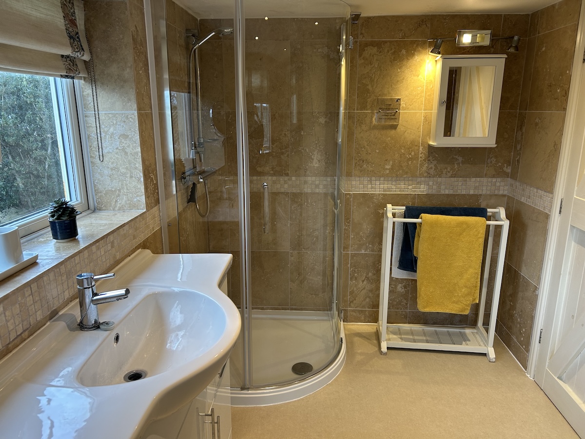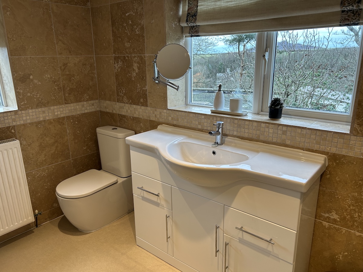 The bathroom has a large vanity unit, a separate shower and deep bath in which to relax. From the bathroom there are views towards Carn Llidi, the highest point of St David’s Head; the historic Bishops Palace and our tranquil garden, except when the rooks are roosting at dusk!